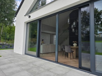 Moskitiera plisowana jest doskonałym rozwiązaniem w miejscach, gdzie zastosowane zostały duże przeszklenia drzwiowe, np. wyjścia na patio lub taras. Modułowa budowa moskitiery pozwala ją składać w systemie jedno lub dwuskrzydłowym - do środka lub na jedną stronę. Plisowana siatka po złożeniu całkowicie chowa się w profilu aluminiowym. Tym samym zajmuje niewielką ilość miejsca po jej zsunięciu.